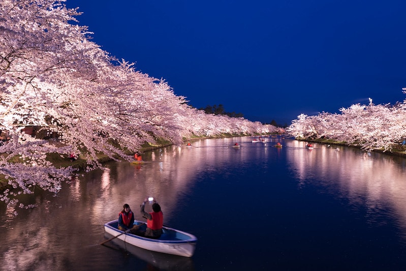 El parque del Castillo de Hirosaki, en la prefectura de Aomori, no solo es conocido como punto para contemplar sus 2.600 cerezos en flor con el castillo de fondo, también por albergar el Somei-Yoshino, un cerezo centenario plantado en 1882. Otras de las atracciones de las que disfrutar en este Festival de los Cerezos en Flor son sus luces nocturnas, el túnel de sakura, las actuaciones y la música. Los últimos días de floración, los pétalos vas cayendo delicadamente sobre el agua de los canales de este parque, creando escenas bellísimas que pueden observarse desde los puentes o desde las barcas de remos que los recorren.